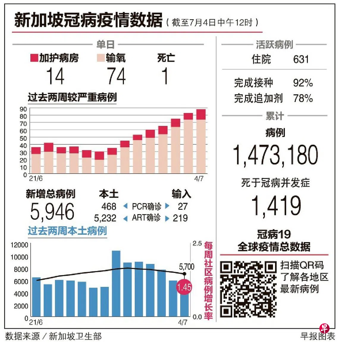 根据卫生部网站星期一(7月4日)晚上更新的数据,本地又增加一起死亡病例。重症病患增至88人,比3日多五人。其中74人需要输氧,14人在加护病房。7月1日至4日的数据显示,在加护病房的冠病患者当中,有一名介于1岁至11岁的孩童。