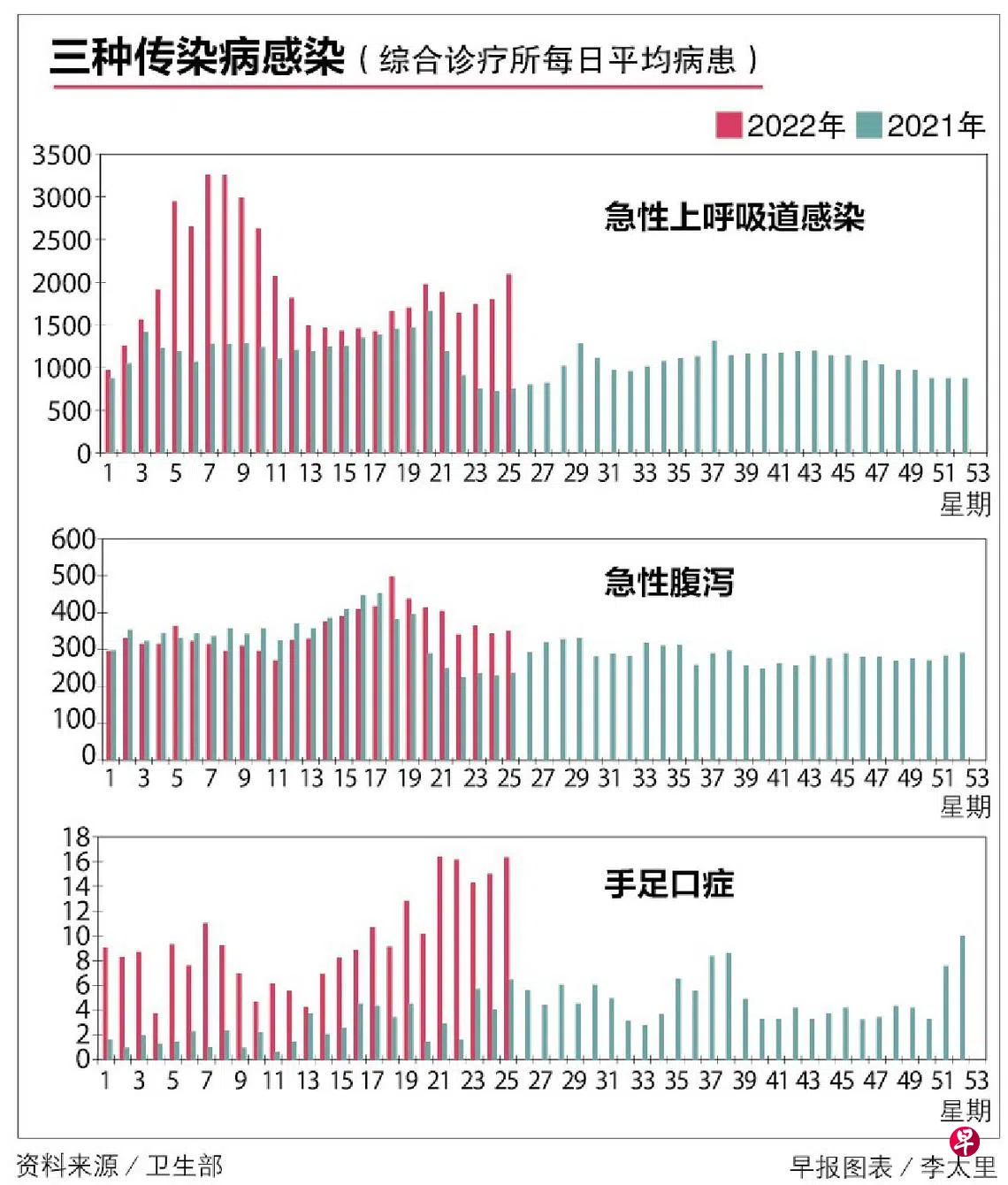本地急性上呼吸道感染病例在6月学校假期期间呈上升趋势。综合诊疗所在上周每日平均有2000多名病患求诊,是今年3月中旬以来的新高。急性胃肠炎和手足口症的病患也有增加。