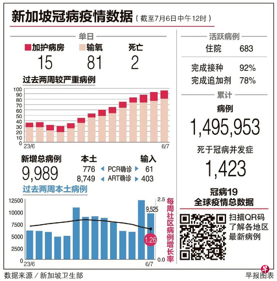 我国星期三(7月6日)新增冠病病例显著回落至9989起,比星期二的1万2784起少了2795起。卫生部长王乙康指新一波疫情已接近或达到顶峰,但新加坡尽量不会通过收紧安全管理措施或是扩大疫苗接种来应对这一波疫情,而是要靠医疗能力来减缓冲击。