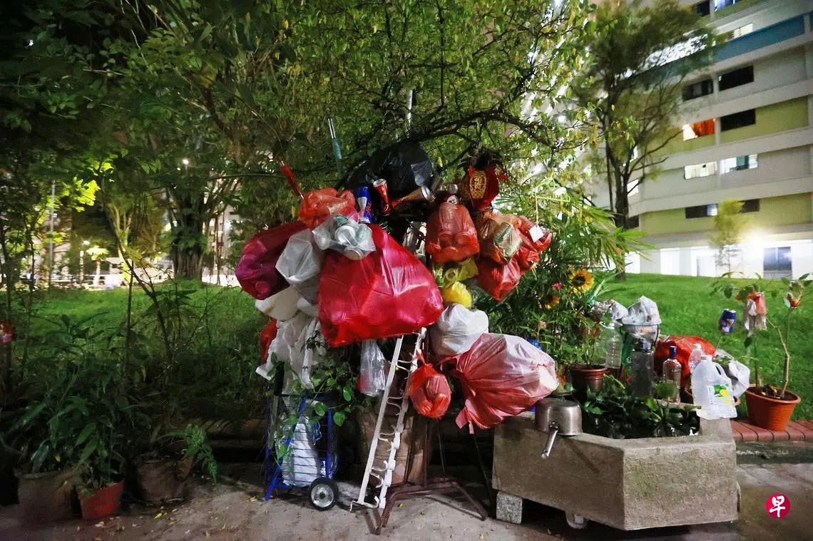故态复萌!义顺垃圾屋老妇继续拾荒,杂物不仅堆满住家前,连盆栽上也挂满纸袋成了“垃圾树”,邻居纷感不满。