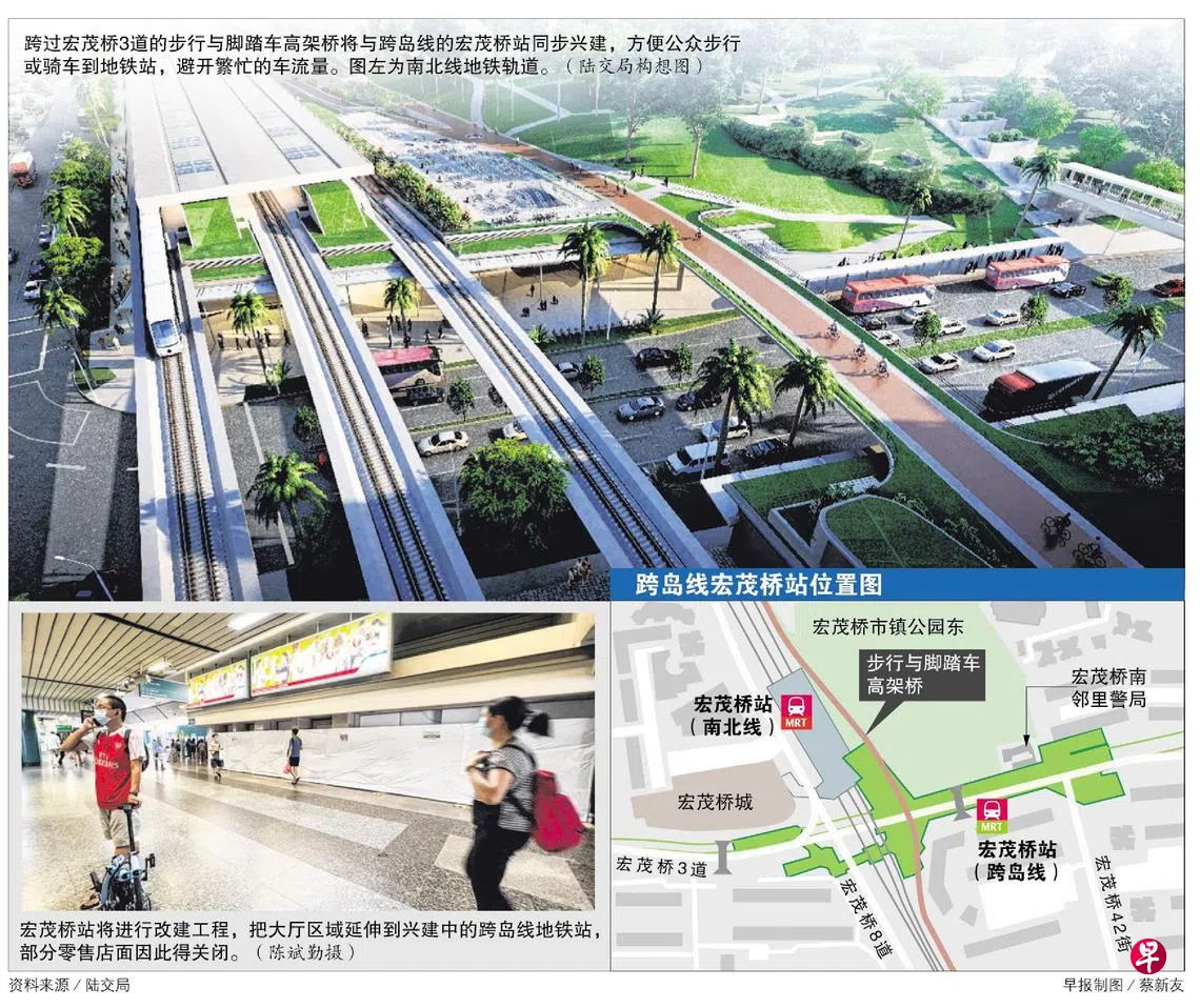 宏茂桥地铁站是现有南北线与未来跨岛线的转换站,为确保乘客能无缝往来这两条线的地铁站,陆交局将把南北线的宏茂桥站大厅延伸到兴建中的跨岛线地铁站。现有的宏茂桥站也将增建自动扶梯,并重新设置大厅。
