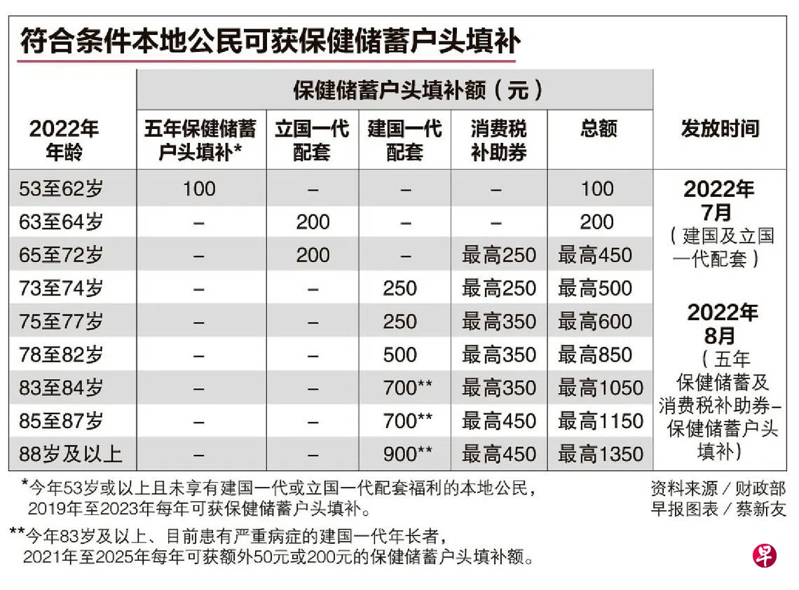 此外,在1969年12月31日或之前出生,今年53岁及以上而且没享有建国一代或立国一代福利的公民,8月底会获得100元的保健储蓄户头填补。政府是在2019年财政预算案宣布,每年为这批公民填补保健储蓄,为期五年。今年是第四年填补。