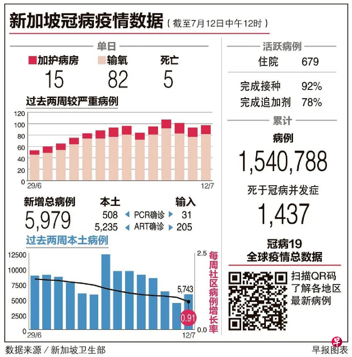 本地星期二(7月12日)新增5979起冠病病例,再有五人因冠病并发症过世。每周病例传播率在连续28天高于1后,下降至0.91。
