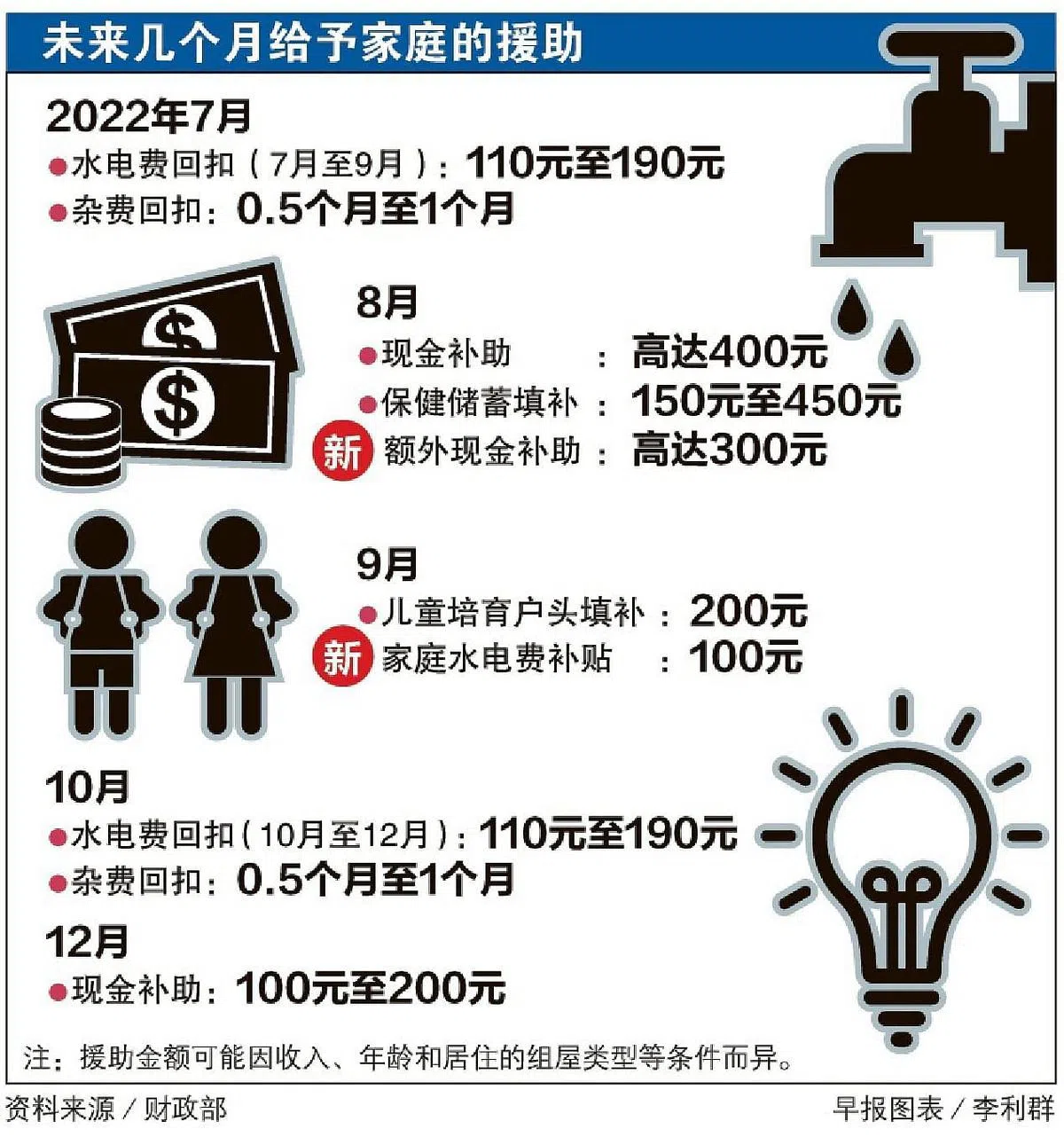 符合条件的公民8月可获得最多700元现金补助,分别是最多400元的消费税补助券现金补助,以及最多300元的额外消费税补助券—特别现金补助。此外,57万5000名65岁及以上的公民,也可获得最高450元的消费税补助券—保健储蓄户头填补。
