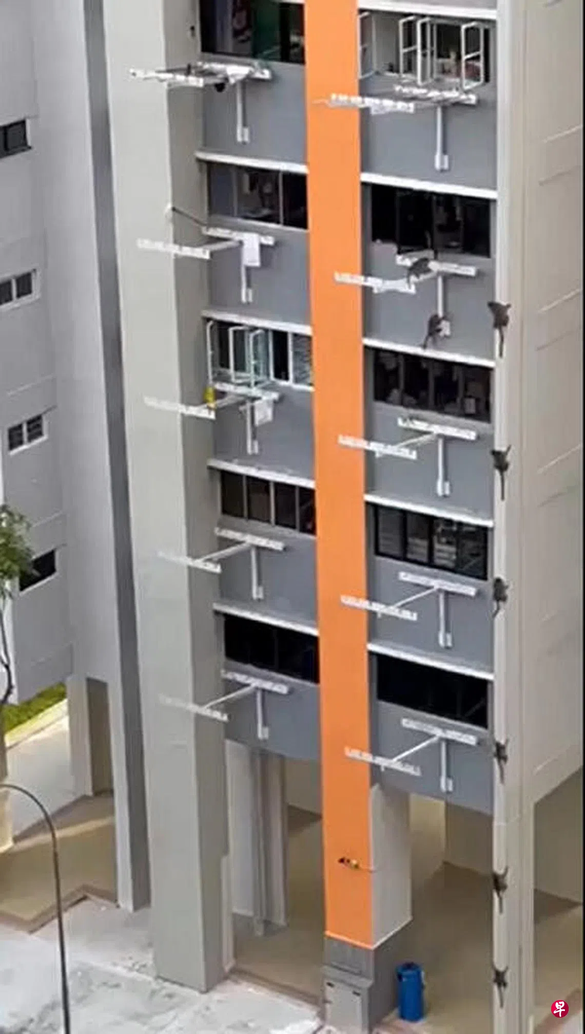 10只野猴大闹金文泰组屋区,爬入五楼单位,之后一只接着一只攀爬,顺墙而下。