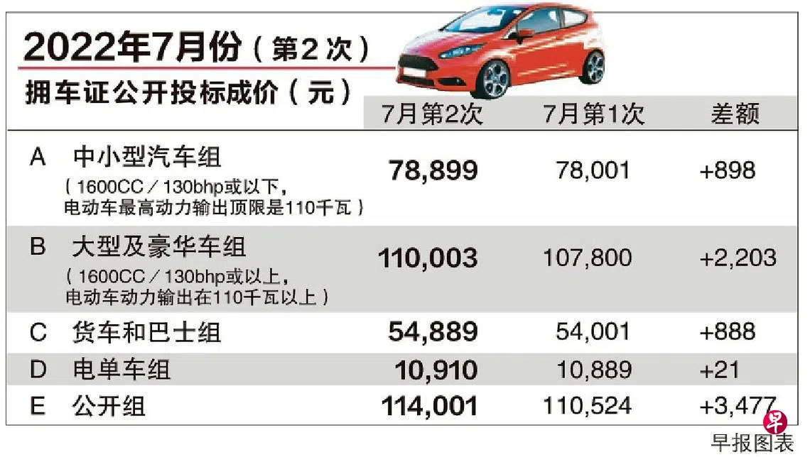 7月第二轮拥车证公开投标活动星期三(7月20日)下午结束,应付大众市场的中小型汽车(A组)拥车证成价上涨898元(1.2%),报7万8899元。