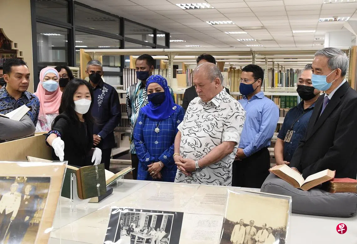 马来西亚柔佛州苏丹依布拉欣(前排右二)星期五(7月22日)上午走访新加坡尤索夫伊萨东南亚研究院,阅览研究所图书馆收藏的一些历史文件,包括驻新加坡的英军前辜加军官朗赫斯特(H.M. Longhurst)捐献的新加坡和马来西亚地图。