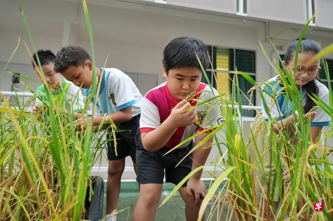 育能小学今年1月为小五学生展开为期6个月的水稻种植活动,学生在本地稻米公司Golden Sunland的共同创办人、水稻专家陈建元的指导下,在校舍顶楼用塑料箱子种植水稻。