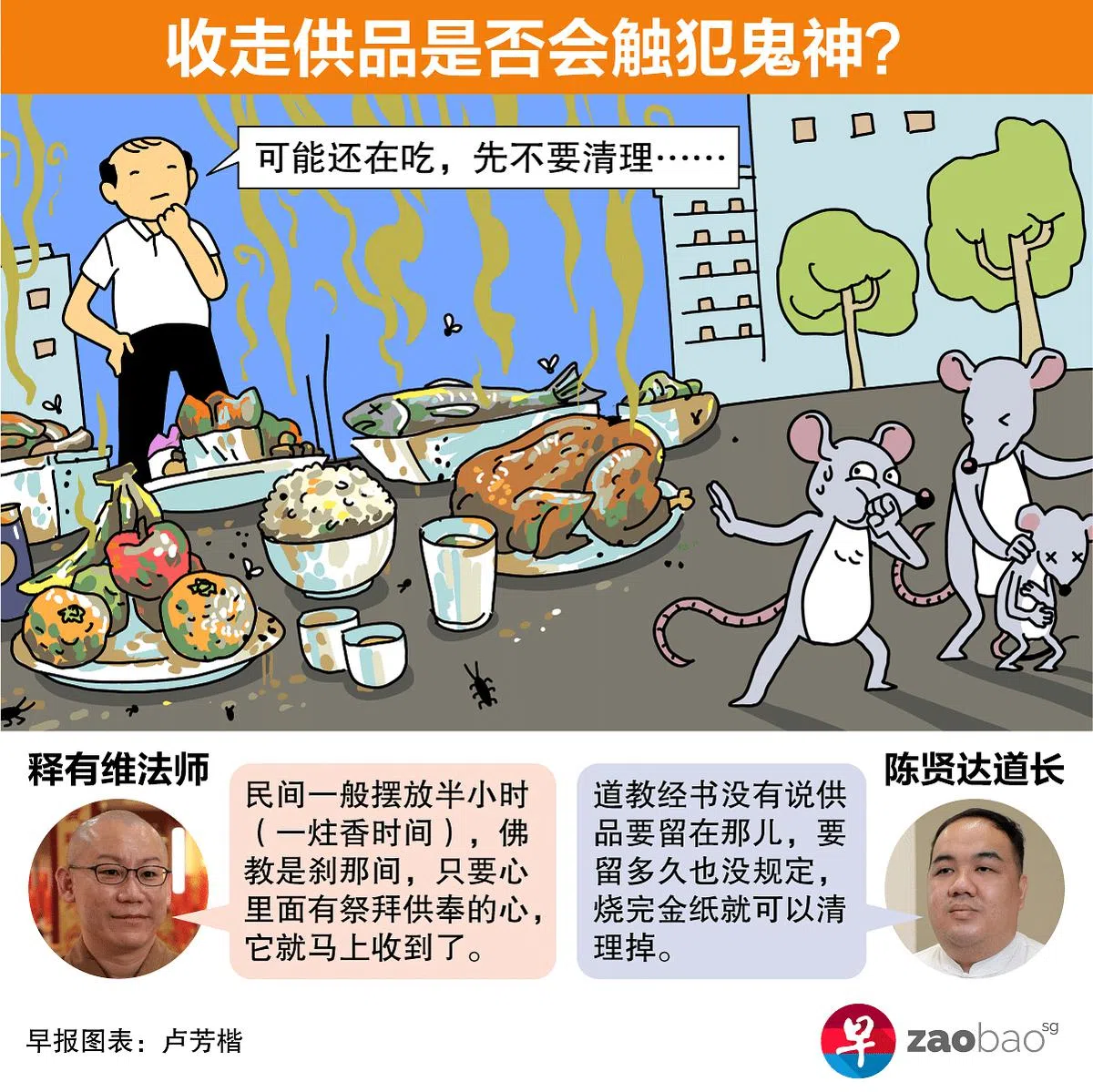 陈贤达也说,道教没有把供品留在祭祀位置的规定。“经书没有说要放在那边,都是民间说法。烧完金纸就可以清掉,没有所谓太早清理,触犯鬼神一说。”