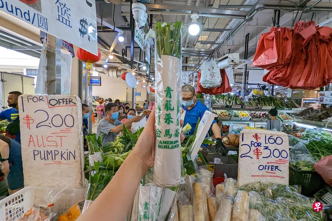 《联合早报》记者星期四(7月28日)上午走访油池湿巴刹了解到,从马来西亚进口的苋菜、小白菜、芹菜等叶菜的零售价并没有明显的价格浮动,大多数摊贩以三小把2元的价格售卖这些叶菜。