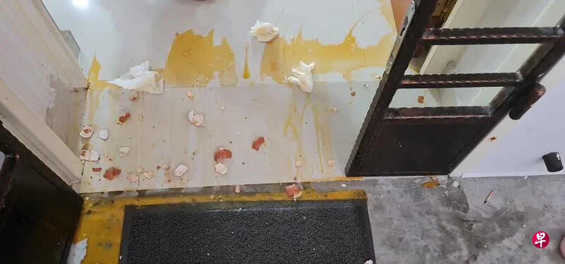 盛港组屋邻里纠纷,妇女连续两次向楼上单位丢蛋,门外一片狼藉,邻居一家吓坏报警,妇女协助调查。