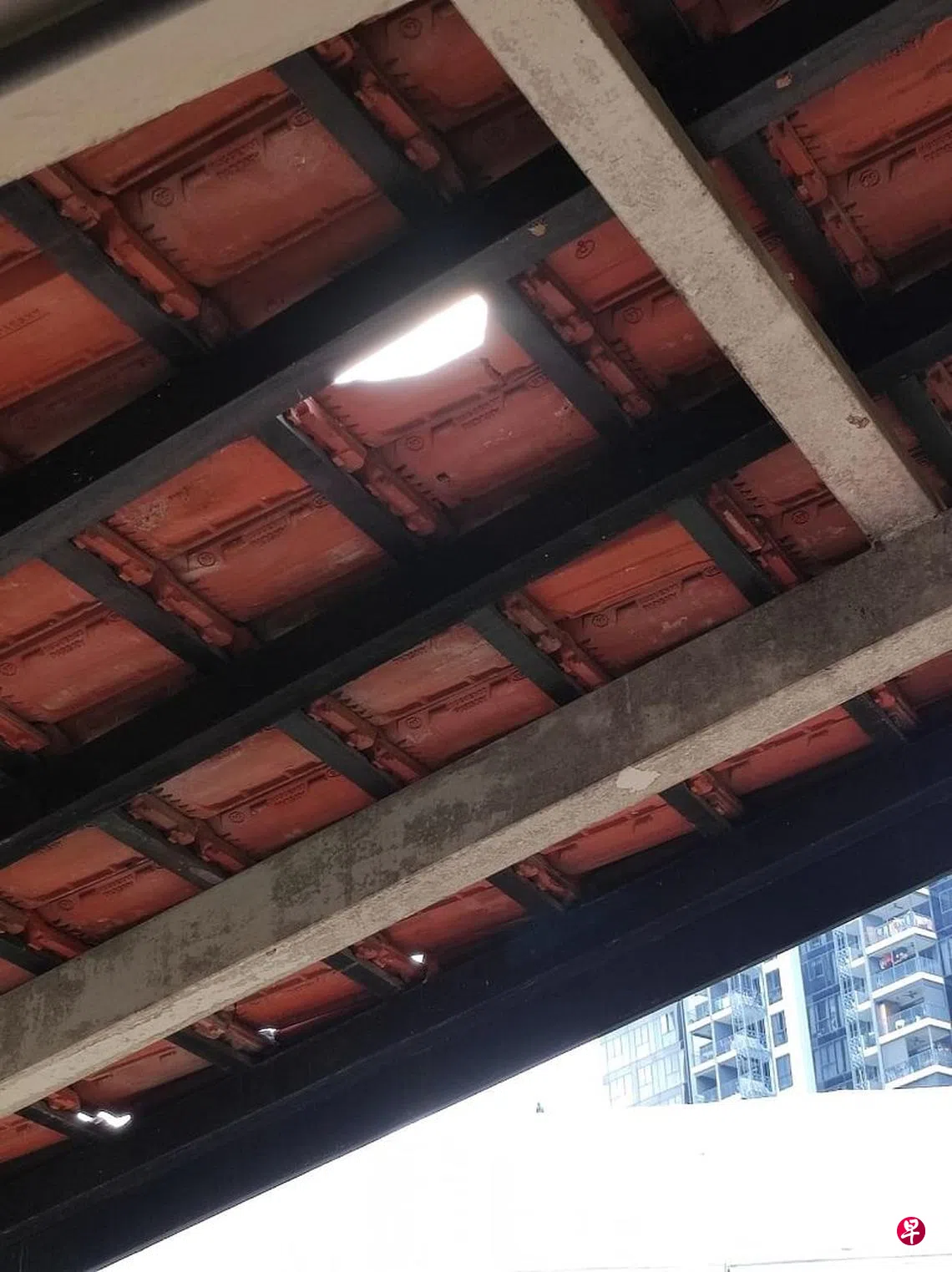 《新明日报》记者星期天(7月31日)走访时发现,被砸破的有盖走道顶盖已用石灰补上,地上仍可见掉落的瓦片碎片。