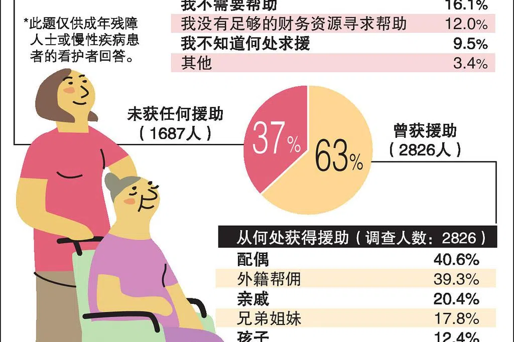 另外,超过六成或2826名有帮手分担责任的看护者中,主要援助来源分别是配偶(40.6%)、外籍帮佣(39.3%)、亲戚(20.4%)、兄弟姐妹(17.8%),以及孩子(12.4%)。