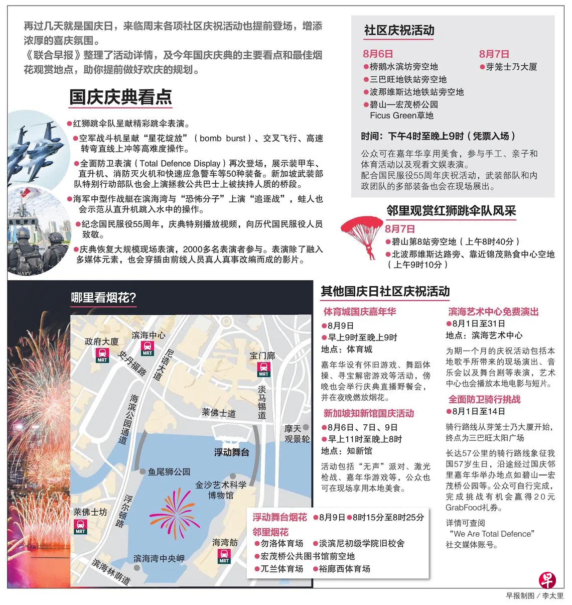 根据警方文告,从8月9日零时至月10日早上8时之间的不同时段,芬礼逊埔(Finlayson Green)、滨海林荫道、莱佛士道、淡马锡道、共和国道、共和国林荫道、莱佛士林荫道、海湾道、淡马锡林荫道、哥烈码头、莱佛士连路、勿拉士巴沙路、尼诰大道、海滨公园通道、浮尔顿路的部分车道或路段将封闭。