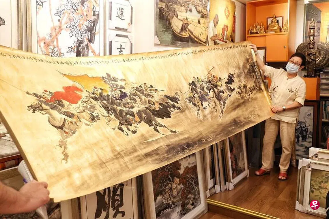 记者近日走访画廊,发现画纸摆在桌面,还有部分带框的画作也立在地上和挂在墙上。这些水墨画包括山水、人物、战马和书法等,甚至还有昔日新加坡系列和多张油画。