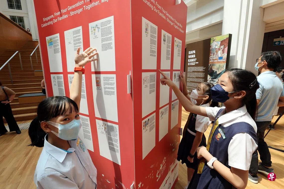 “万众一心”新加坡学习展星期一(8月8日)在国家美术馆开幕,通过电子屏幕展出超过9万名学生参与制作的图文故事和对国家的祝福,并选出其中180则图文以实体展板呈现。其中10所学校的学生来到展场,为大家叙说他们和长辈互动的故事。