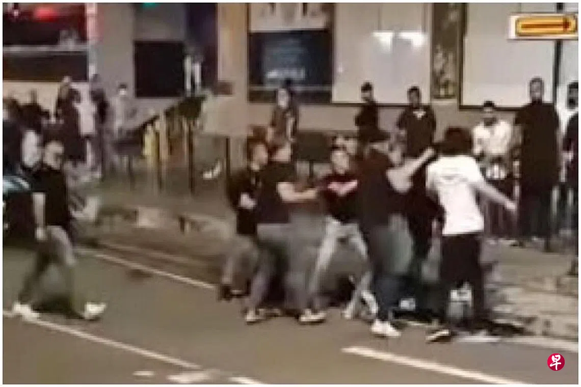 乌节路豪杰大厦外,20多人深夜在马路上扭打、群殴,场面混乱。