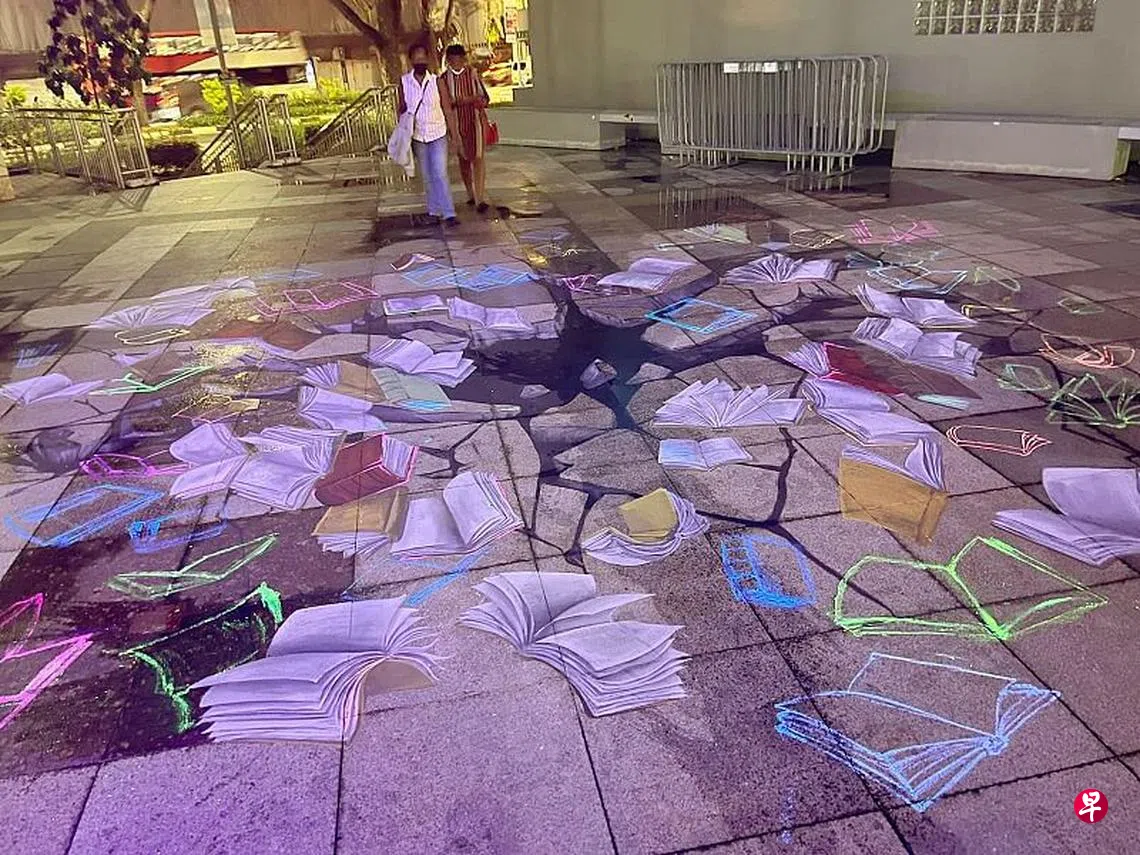 本地一名视觉艺术家在“书城”百胜楼入口的地上作画,但这幅“书本满溢”的画作,掀起一些书店业者热议,认为更像是“书本落入黑洞”,不尊重文学界。