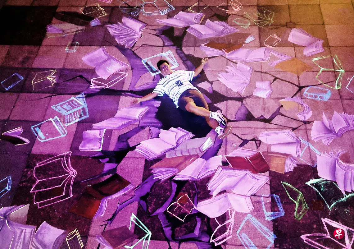 《联合早报》记者星期四傍晚5时走访现场,白天的画作看起来仿佛地上裂开,黑洞周边有多本翻开的书籍。当天色暗下,用磷光胶勾勒的书本在紫外线灯下亮起时,则相当引人注目,但停下来欣赏作品的人不多。
