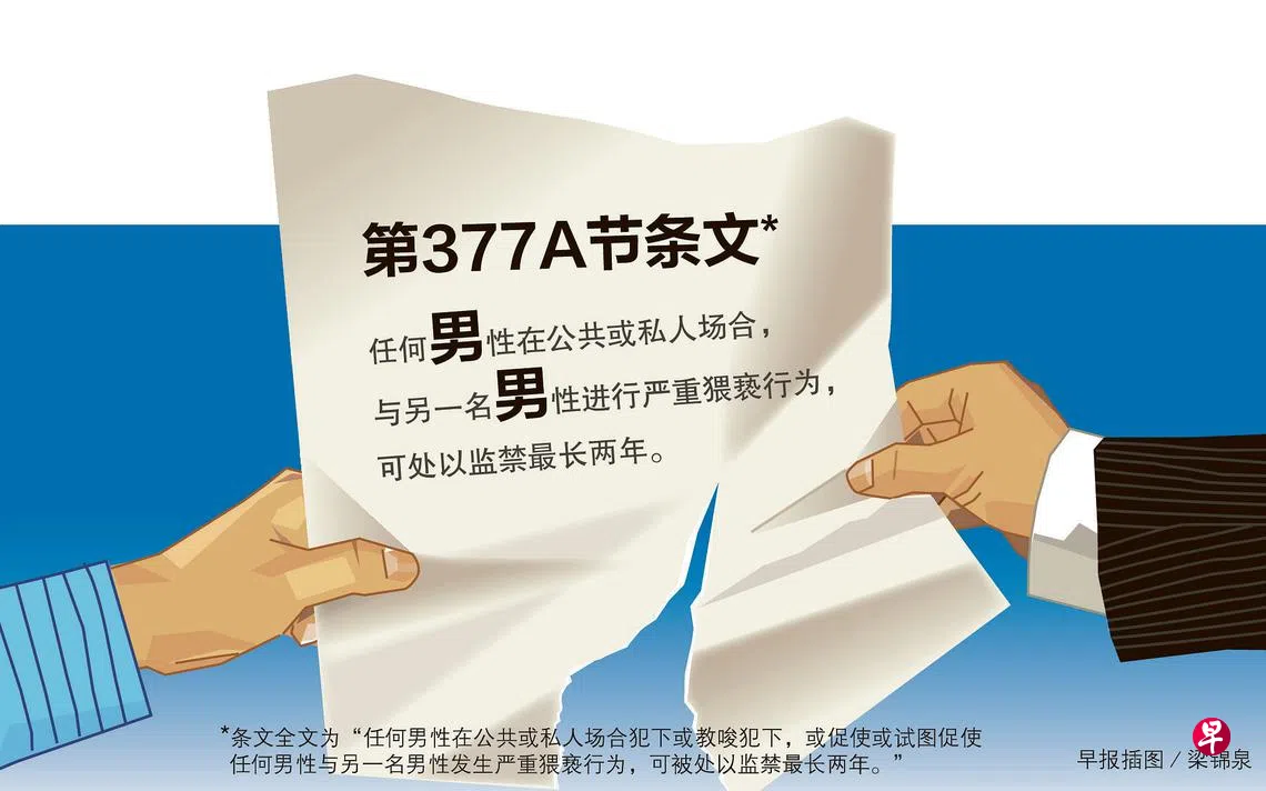 这个沿袭自英国殖民地时期的条文规定,任何男性在公共或私人场合犯下或教唆犯下,或促使或试图促使任何男性与另一名男性发生严重猥亵行为,可被判监禁最长两年。随着社会对同性恋的态度逐渐转变,政府近期表示政策和法律须跟上,除了近年已不执行377A条文,也正在对这条文的存废问题斟酌最佳做法。