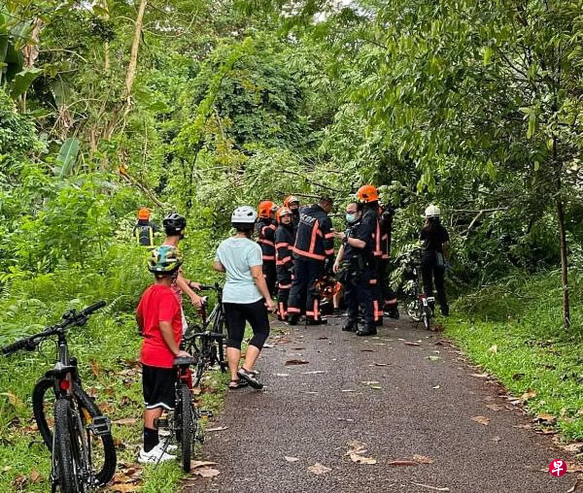 脚踏车骑士邱女士(49岁,教师)告诉记者,星期六傍晚到铁道走廊骑车时,获悉不远处有大树倒下,因此前去查看。她透露,现场有一名男骑士透露说,他亲眼看到大树轰然倒下,阻断前方去路,还有一对男女骑士遭殃。