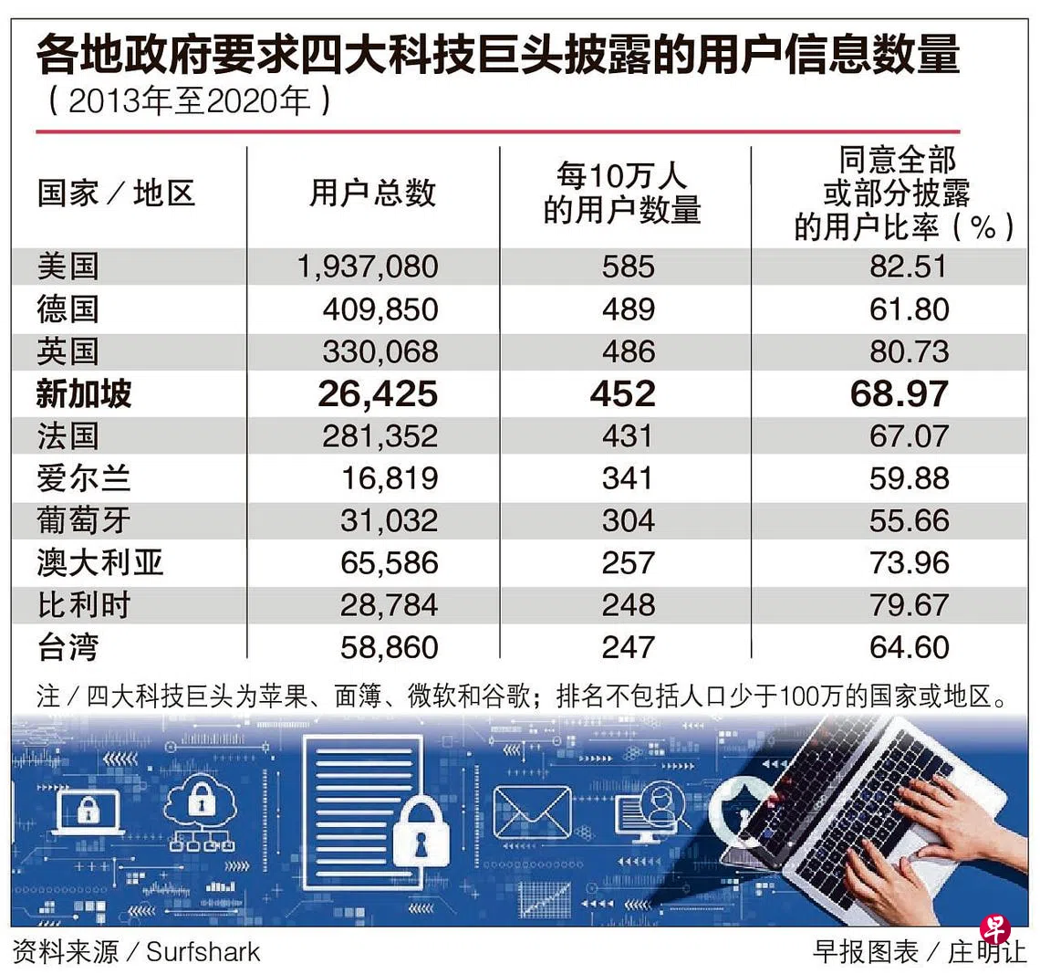 新加坡政府过去八年来,向四大科技巨头索取2万6425个用户信息,约为每10万人口452个用户信息,在人口超过100万的国家和地区中,排名第四。