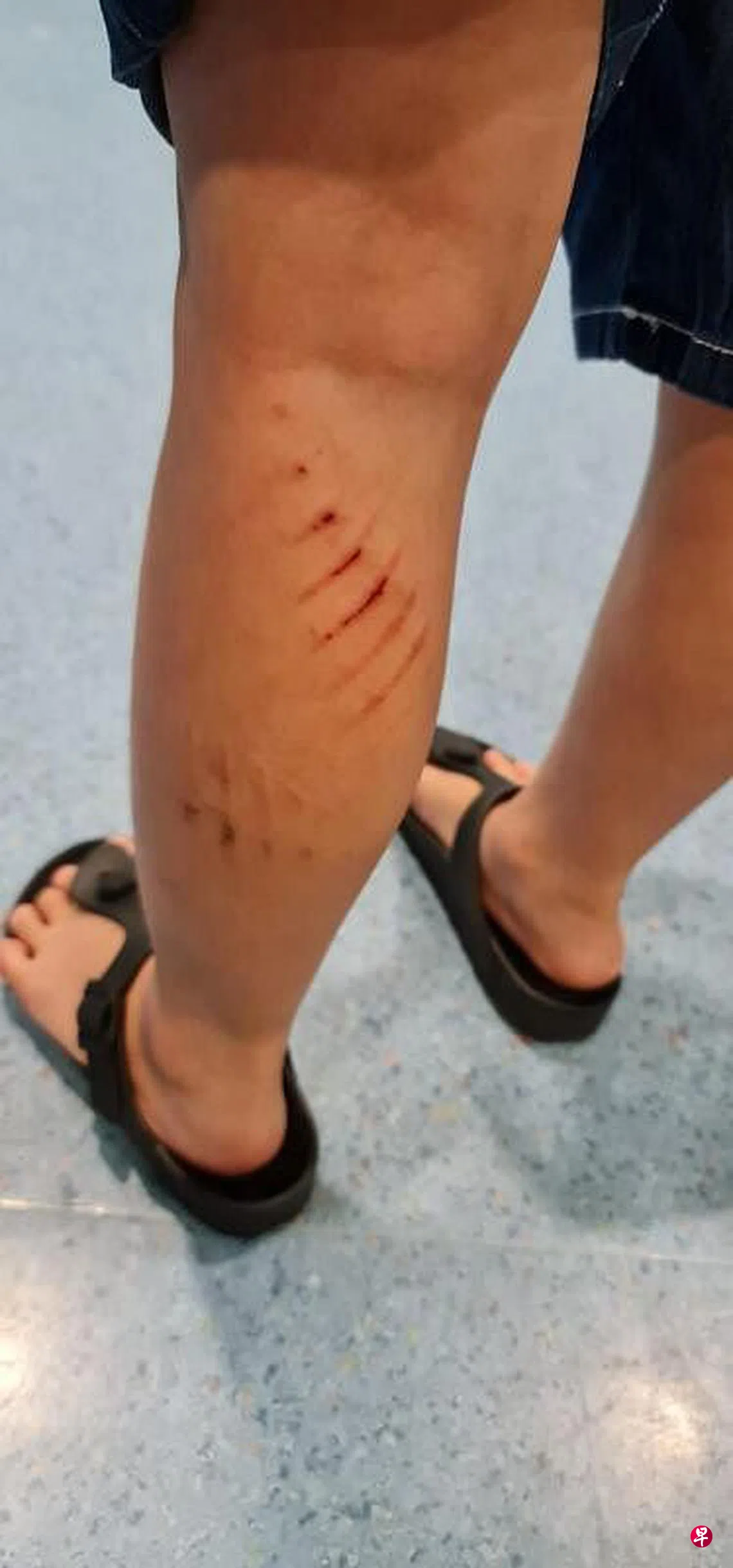 “我马上冲过去扶儿子起来,发现儿子全身颤抖,腿也流血,一直哭着喊疼。我赶紧抱着他安抚,并查看伤势,连呼叫救护车的热线号码都想不起来。”