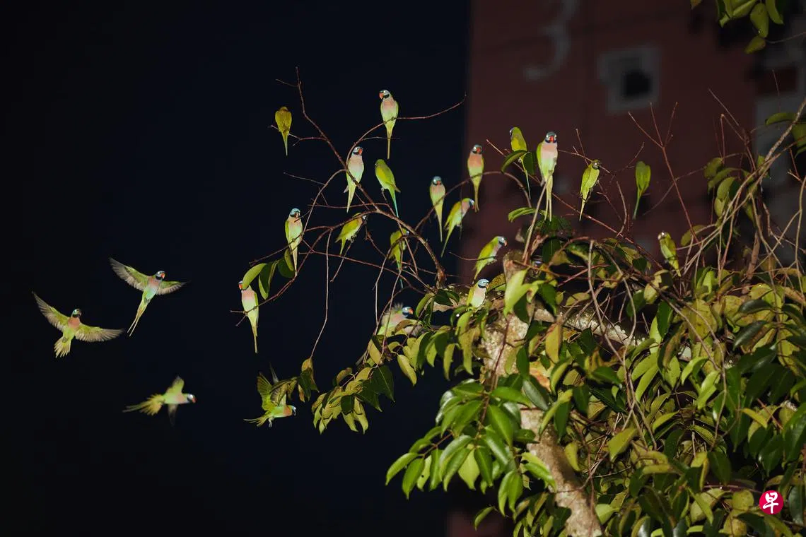 每到入夜时分就群聚,不“唱”上一两个小时誓不甘休,数百只绯胸鹦鹉把组屋楼下大树当家,繁衍了一代又一代,大部分居民表示早就习以为常,已经学会人鸟共处,但仍有小部分居民不堪其扰,促当局采取行动把群聚的绯胸鹦鹉赶走。