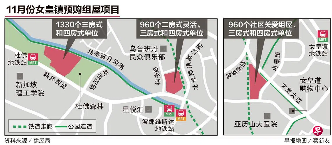 根据建屋发展局星期二(8月30日)在网站上公布的位置图,预计11月推出的九个预购组屋项目共有约9500个单位,其中三个在女皇镇,有一个属于杜佛森林所在的乌鲁班丹区,共有约1330个三房式和四房式单位。