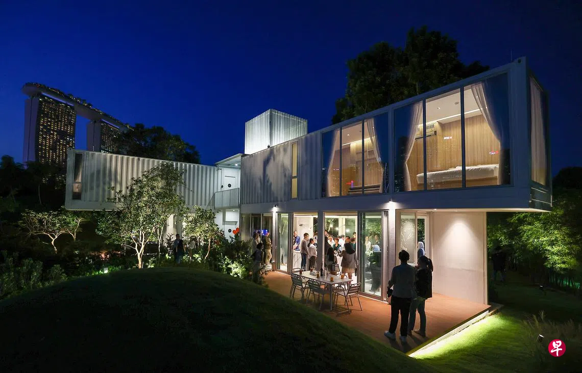 位于滨海湾花园“幽雅花园”的“恬园居”集装箱酒店,融入可持续元素,包括可为酒店提供80%电力的太阳能板。这是贸工部亲商小组“先行者计划”下的试验项目,集装箱酒店租约到期后会搬迁至其他地点。