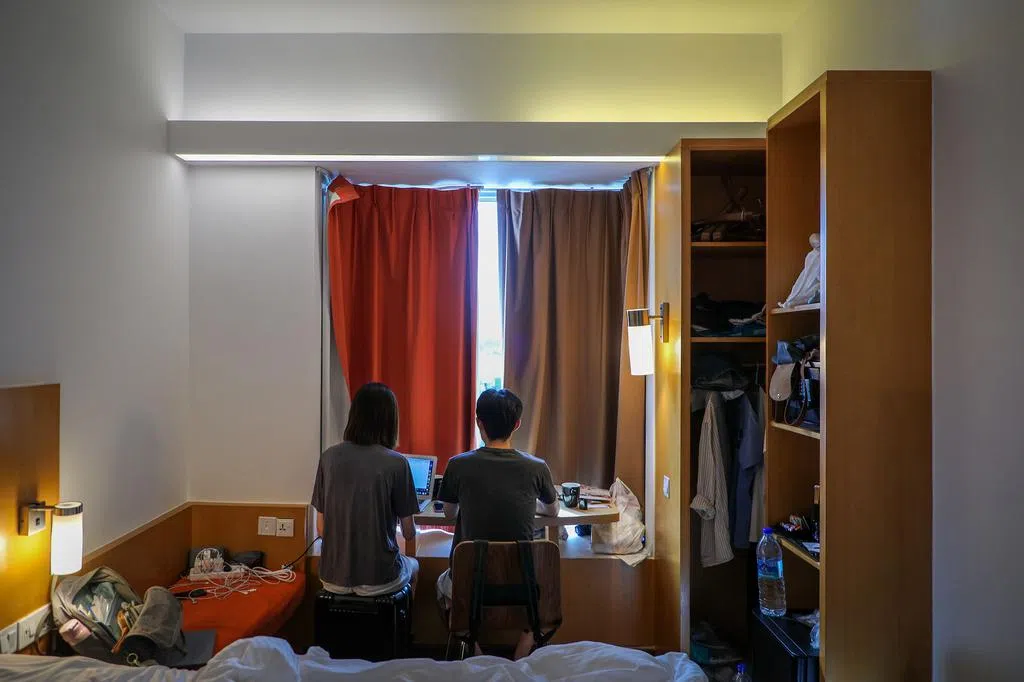 受访当日,林戈和妻子并排坐在酒店窗边的书桌前,房间里只有一把椅子,妻子就坐在行李箱上。