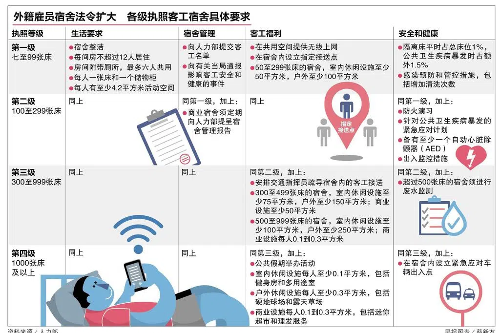 明年4月起,有至少七个床位的1600座客工宿舍,包括工厂改造宿舍,都将纳入外籍雇员宿舍法令的管制范围,以提高宿舍管理和卫生水平。这些宿舍今后必须提供专门的隔离床位、无线上网和休闲空间等更规范的环境及安全设施,才可获得营业执照。