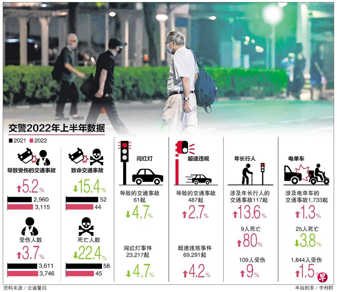 今年上半年,本地的致命交通事故和死亡人数同比减少,但涉及年长行人且导致伤亡的交通事故和伤亡人数都增加。涉及年长行人的车祸当中,有高达45.3%是年长人士乱过马路造成,情况令人关注。