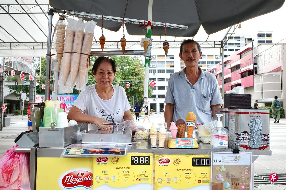 又一列地铁驶过,人们匆匆地出站,四下散开在暮色里。这是纪文忠(70岁)和刘秀美(71岁)夫妇一天里最忙碌的时候,随着地铁接来送往,冰淇淋车前的顾客又多了一些。