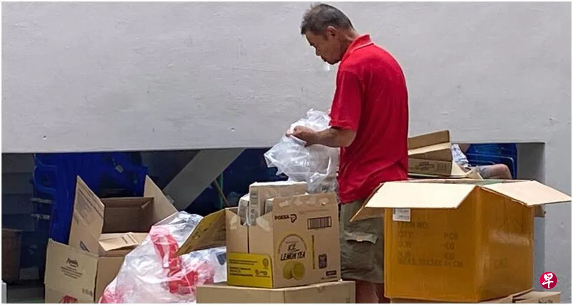 《新明日报》接获读者通报,指文礼购物中心有一名阿叔天天带着一家老少捡纸皮。