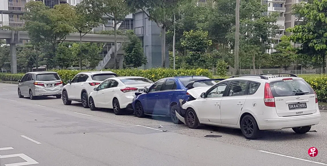 盛港东路星期六下午发生一起五车连环撞事故,造成两人送院治疗。