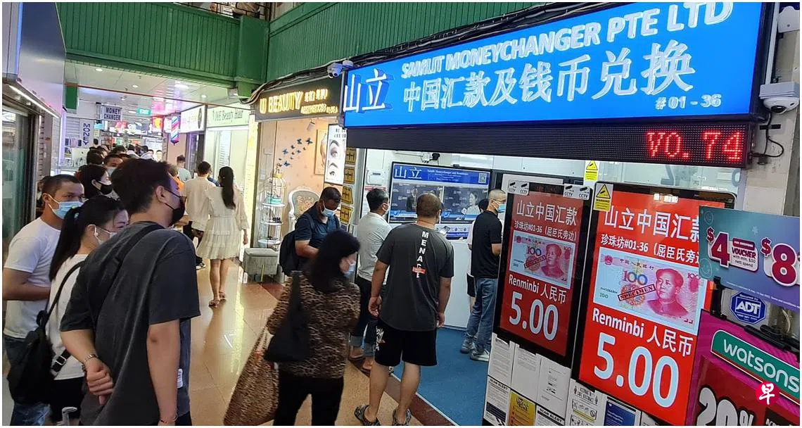 人民币兑换率破5,创下今年新高,大批人到牛车水珍珠坊汇款,有汇款公司出现200人的排队长龙,从店外排到商场外。