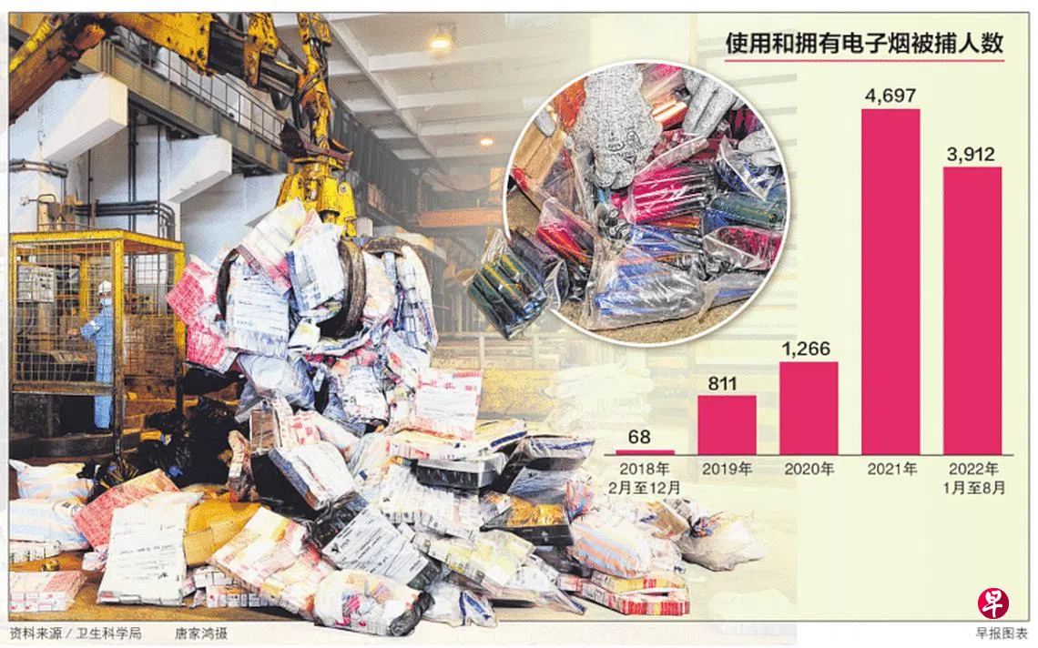 卫生科学局发言人回复《联合早报》询问时说,自我国禁止电子烟后,2018年2月至12月期间,68人因使用和拥有电子烟被逮捕。2019年,人数上升至811人,而2020年增至1266人。到了去年,更激增近三倍到4697人。今年首八个月,已有3912人被捕。
