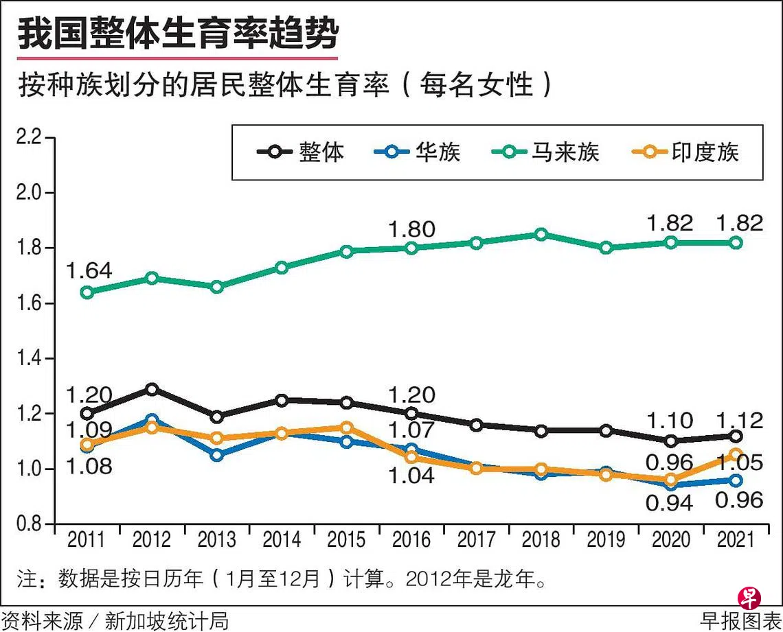 新加坡去年的居民整体生育率从前年的历史低位略微回弹,达1.12。