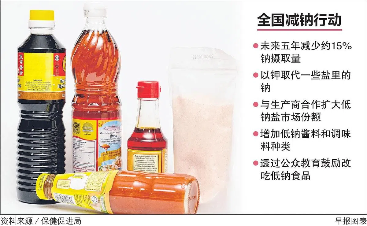 卫生部今年3月在国会拨款委员会辩论新财年开支预算时宣布,保健促进局将三管齐下减少钠摄取量。这三大措施包括以低钠盐替代普通食盐、增加低钠酱料和调味料种类,以及透过公众教育鼓励改吃低钠食品。