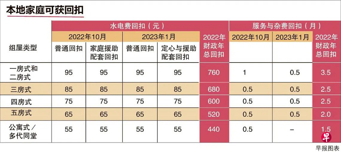 约95万个组屋家庭10月将获得水电费及服务与杂费回扣,加上已在9月发放的一次性100元水电费补贴,每户人家可获得数百元的回扣,协助他们应对通货膨胀。