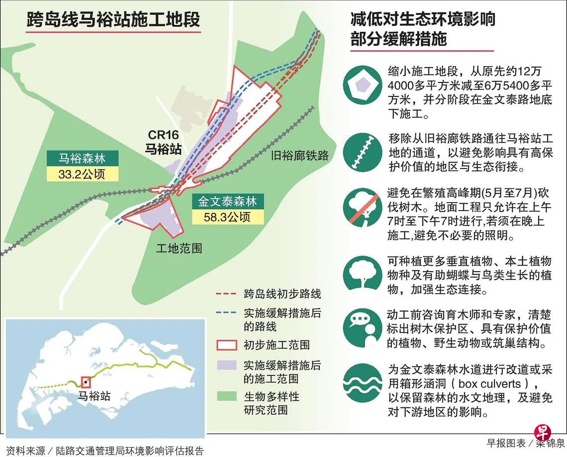 跨岛线第二阶段的马裕站位于金文泰森林和马裕森林之间,为降低建筑工程对自然生态环境的影响,陆路交通管理局将调整相关地铁路线,包括把施工地段缩小近一半,同时采取一系列缓解措施。