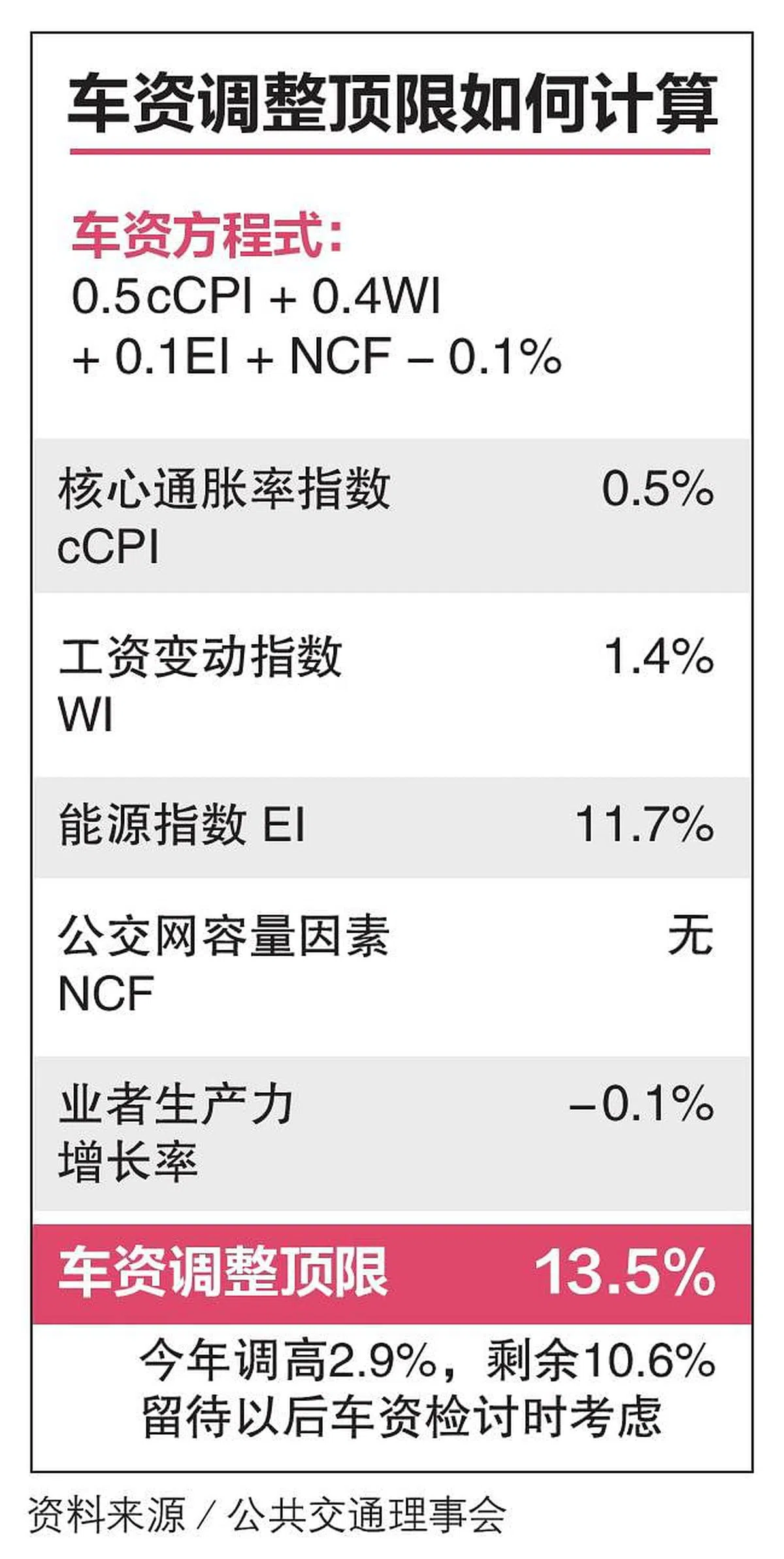 根据车资方程式,今年车资调整顶限为13.5%,不过考虑到通货膨胀压力加剧,公共交通理事会决定,批准今年整体车资调高2.9%,剩余的10.6%留待以后车资检讨时考虑。