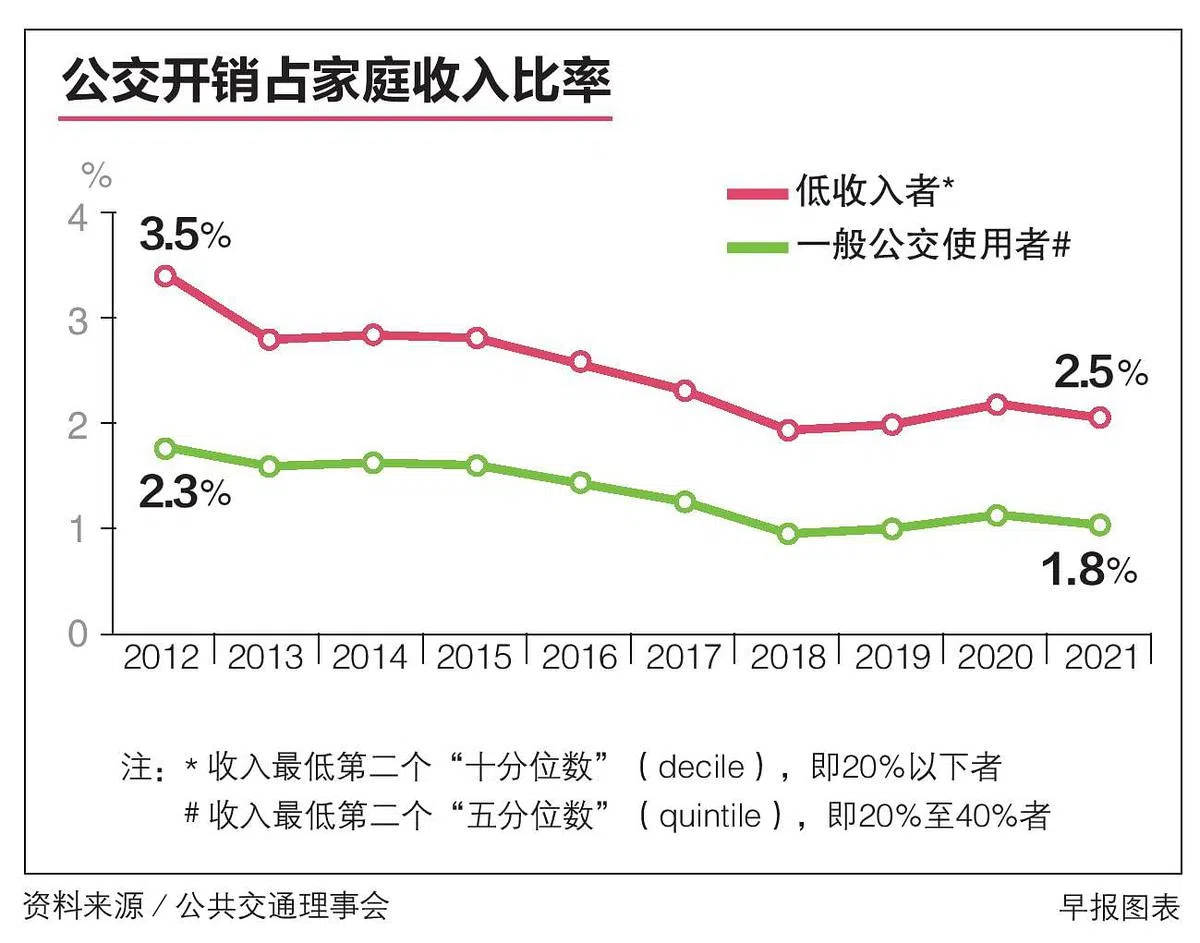根据“公共交通负担能力指数”显示,收入在最低21至40百分位数(percentile)的家庭,即一般的公交使用者,去年平均公交开销约为家庭收入的1.8%,低于2012年的2.3%。