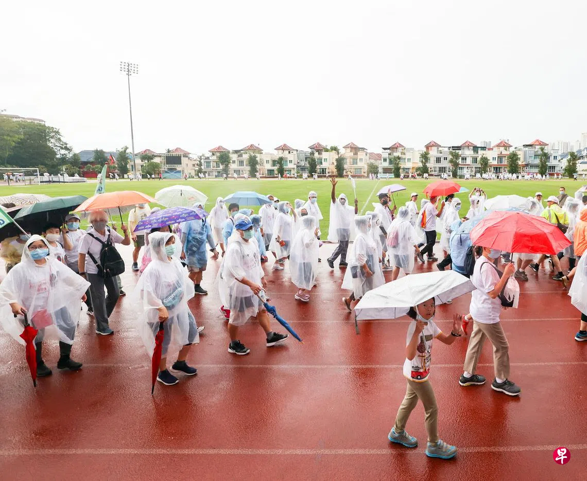 西北轻快步行俱乐部(North West Brisk Walking Club)为庆祝成立20周年,星期天(10月16日)在蔡厝港体育场举办大型轻快步行活动。原本预计近2000人参加的活动因清晨的大雨临时取消,但后来雨势减弱,加上已到场集合的超过1500名公众热情响应,主办方将4公里的区内步行路线改为在体育场跑道上步行10圈。工作人员现场分发防雨披风,参与者兴致高昂,按各个分区在雨中步行约一小时,别有一番趣味。