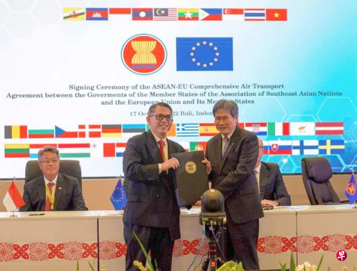 亚细安与欧洲联盟签署区域间全面航空运输协定,推动两个区域之间乃至全球的航空运输业,双方37个成员国的航空公司来往两个区域的直飞航班数量将不受限制。