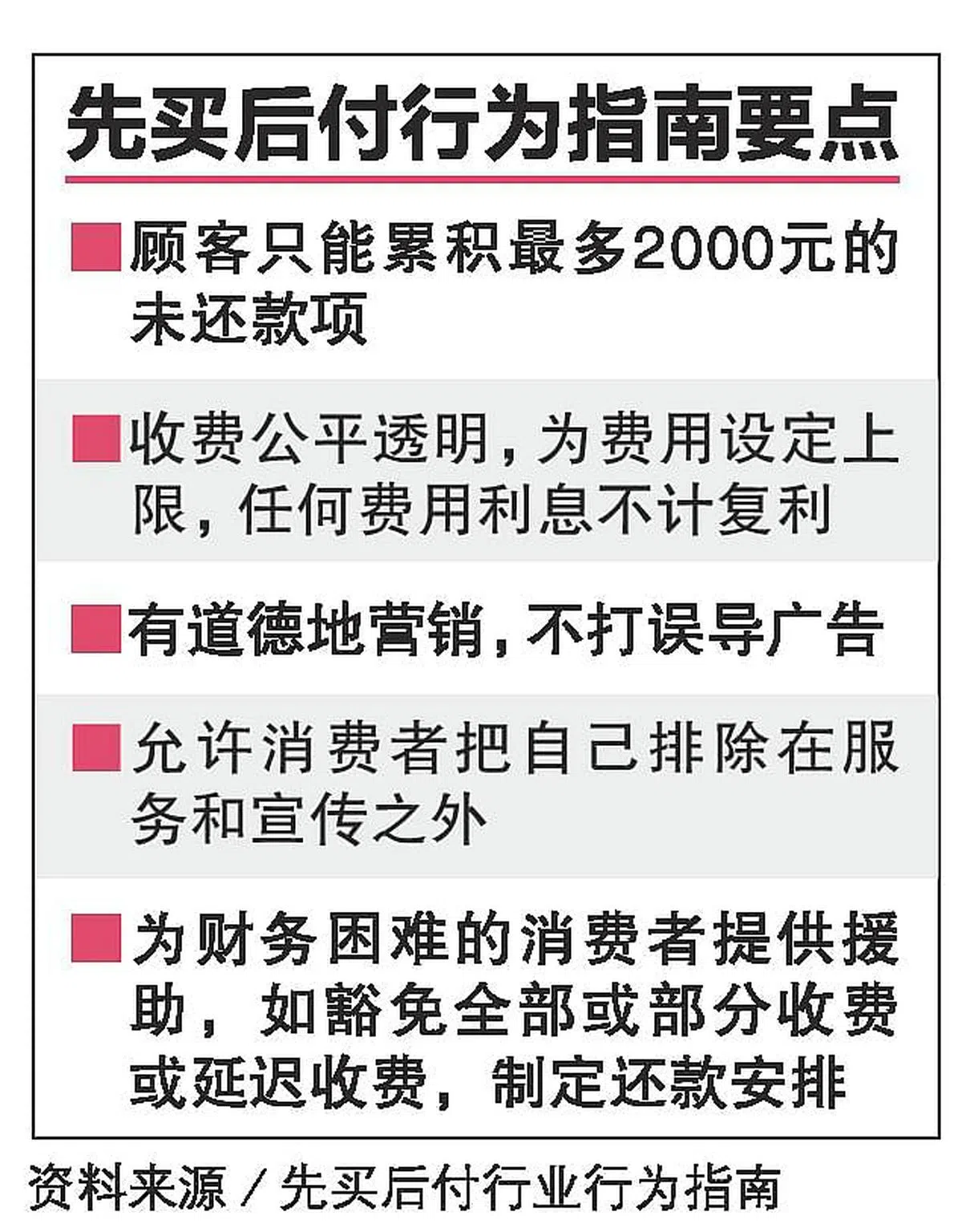 除了交易顶限,行为指南也要求先买后付业者为各种收费设上限,包括逾期违约金(late fee)等。所有费用和利息都不能计算复利。