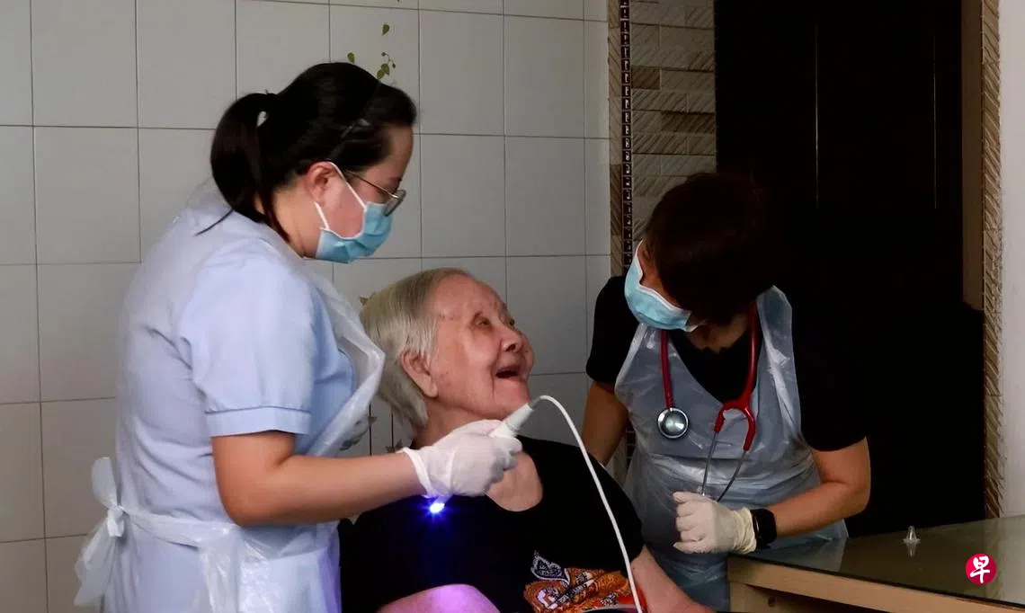 89岁的张红珠(中)行动不便,年长者远程口腔护理计划,让她得以在家接受口腔检查。目前共有199名年长者从计划中受惠,计划两年后料将拓展到至少另外300人。