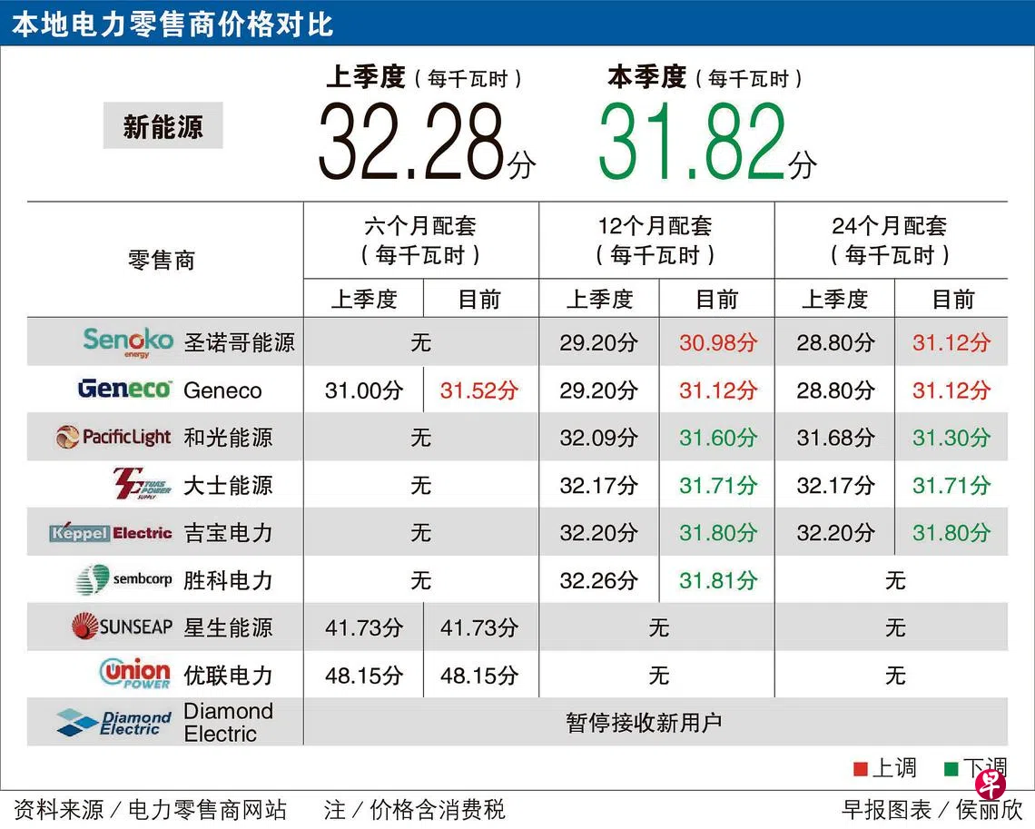 Geneco和圣诺哥能源近期上调配套价格。圣诺哥能源的12个月固定价格配套从上一季的每千瓦时29.20分,调高至目前的30.98分,不过仍是市场最低的。Geneco也把12个月配套的价格从29.20分上调至31.12分。新加坡能源集团早前宣布,本季度的住家电费从每千瓦时30.17分减至29.74分,包含消费税后是31.82分。