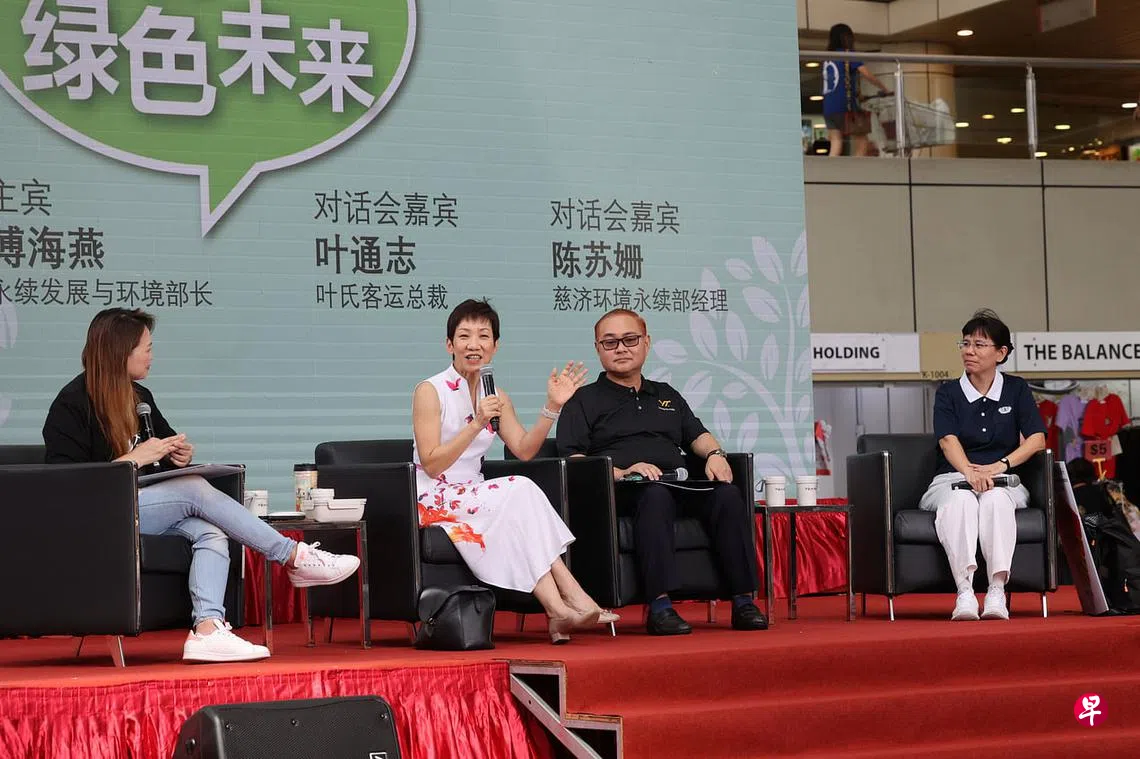 傅海燕星期六(10月22日)出席民情联系组(REACH)与《新明日报》联办的《好好谈一谈之共创绿色未来》对话会,连同叶氏客运总裁叶通志以及慈济环境永续部经理陈苏姗,与民众讨论环保课题。校车业者叶通志谈及公司支持绿色未来的计划,为了降低环境污染并照顾孩童健康,将引进四辆电动校车。